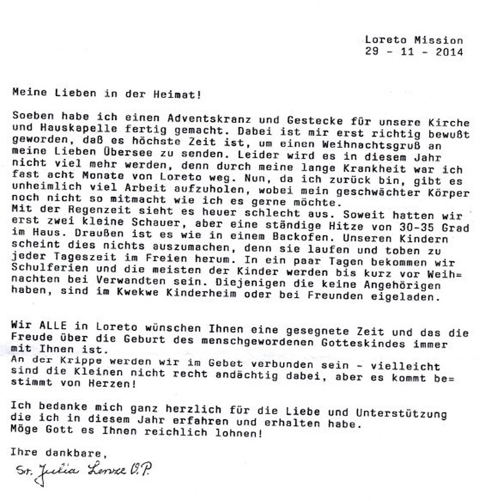 Schwester Julia sieht sich als Wegweiser, das Schwesternleben als Berufung — auch wenn man ihr in Afrika schon nach dem Leben trachtete. Nach Deutschland kommt sie nur alle vier Jahre für drei Monate. Dann stehen Ärztetermine und Besuche von Freunden an, sowie die Organisation von Kleidung und ähnlichem, bei dem sie viel Unterstützung erhält.